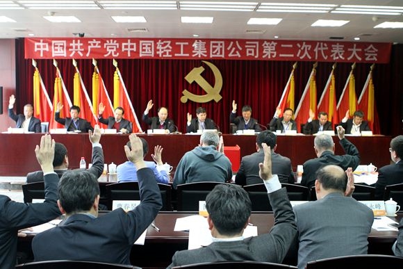 代表們舉手表決通過大會(huì)《中國共產(chǎn)黨中國輕工集團(tuán)公司第二次代表大會(huì)選舉辦法》